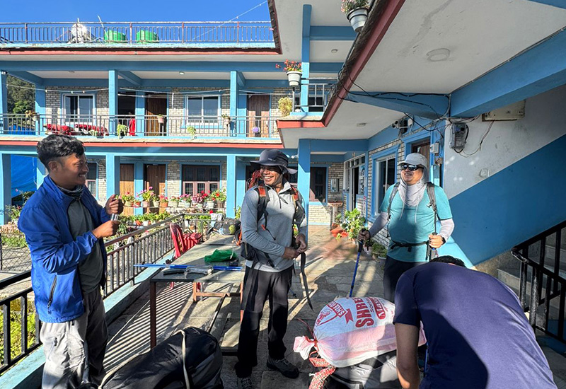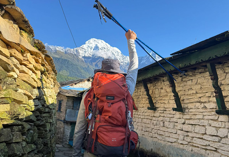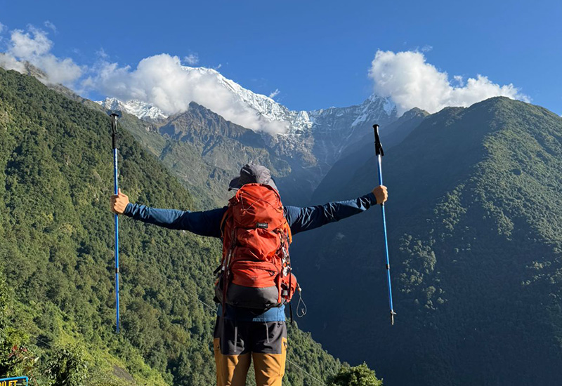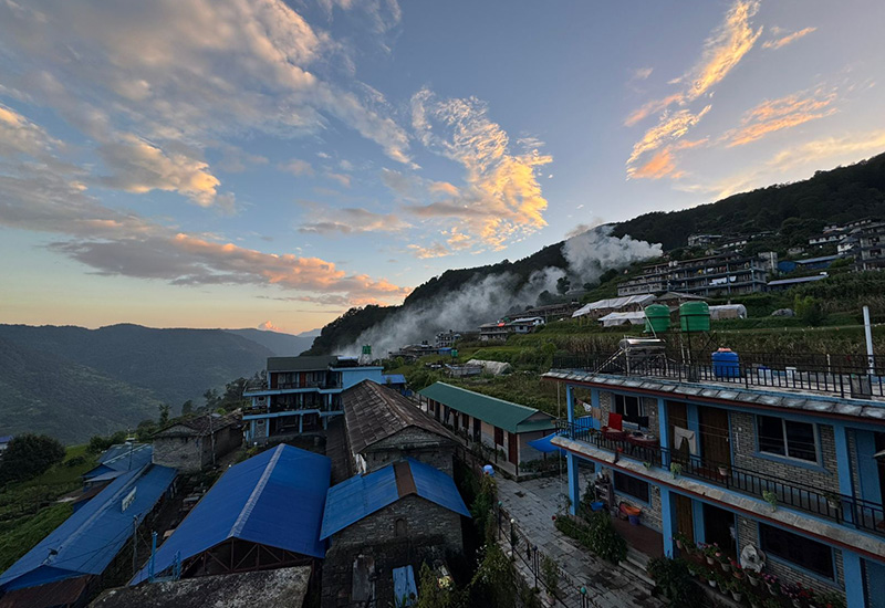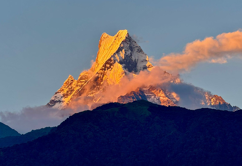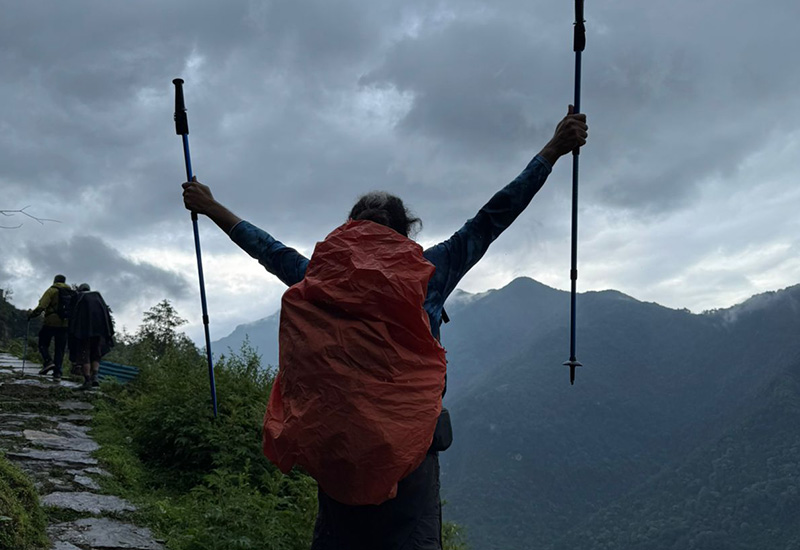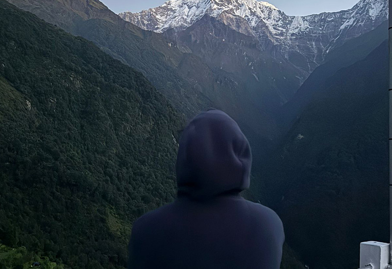 A scenic drive led to Nayapul, the true starting point of the trek. From there, stone steps and winding trails carried us through terraced fields and rhododendron forests. The air turned crisp, filled with the laughter of schoolchildren and the scent of pine. By afternoon, Ghandruk emerged — a beautiful Gurung village nestled on a ridge, facing Machhapuchhre’s (Fishtail’s) silver blade. Evening tea with honey warmed both body and soul.